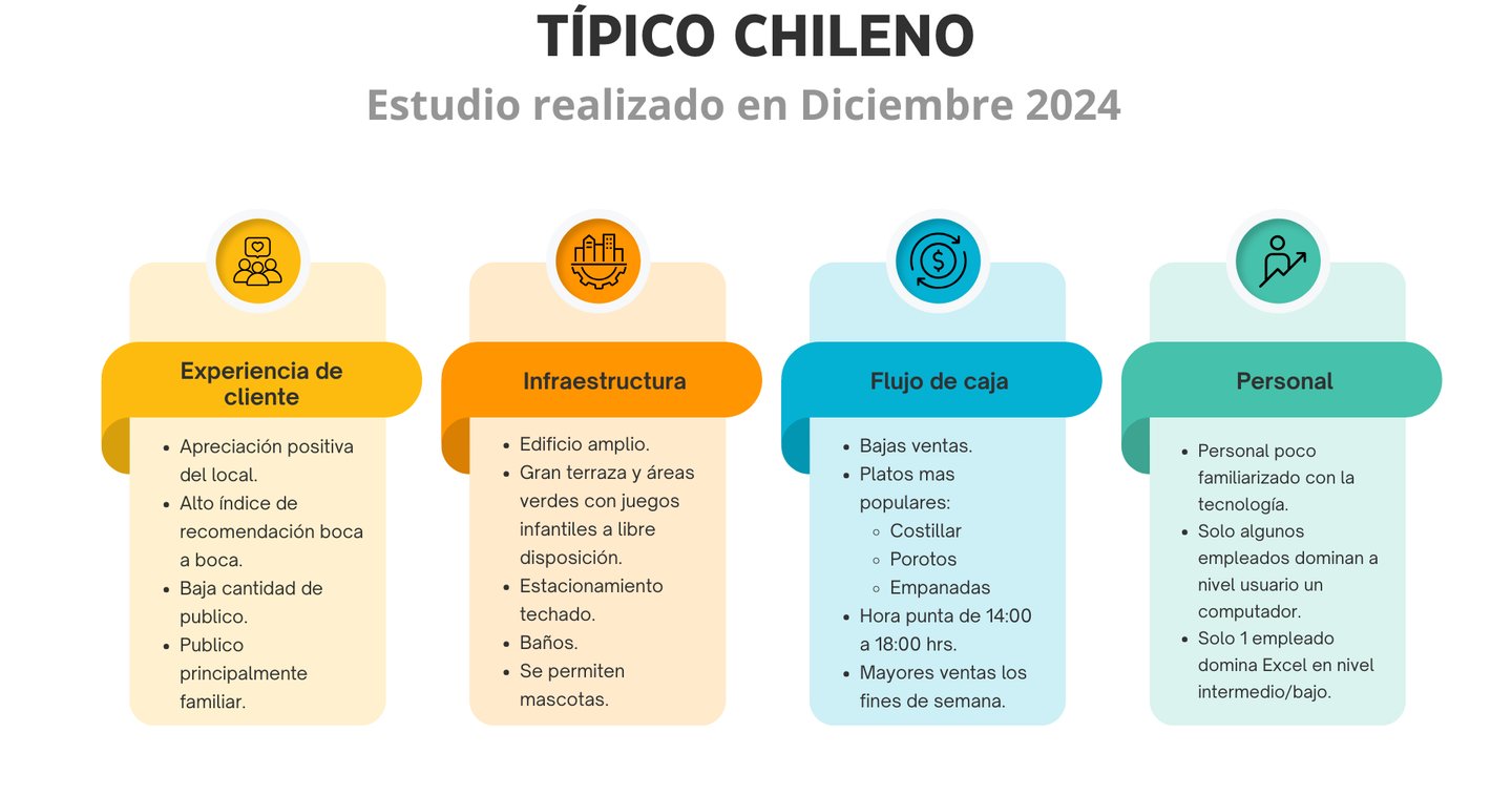 Típico Chileno es un restaurante de comida tradicional Chilena ubicado en Peñaflor. Fue inaugurado en abril del 2023 y a pesar de su buena ubicación, atención cercana y comida deliciosa, no terminaba de afianzarse y aumentar su liquidez.